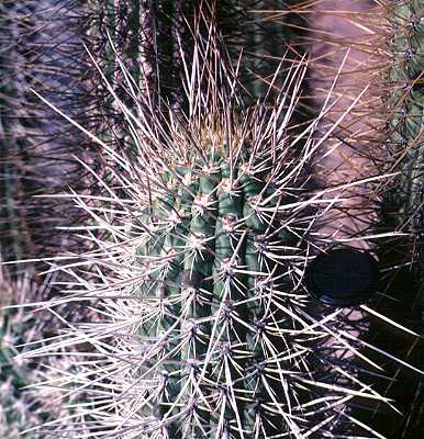 Below, detail of the strong spines of the Eulychnia. You might be able to make out the first signs of flower buds developing on some of the areoles, just above the spine clusters. There is a 5cm lens cap for scale.