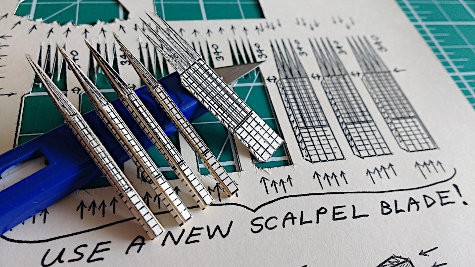 The generic instructions on Sheet N say that battlements and parapets are folded and glued so that they are of double-thickness card, and are only cut out after the glue has set. These aren't marked specifically on each piece, apart from the 'score line', so bear in mind that these very first parts of the model have top top-edges to be folded over, glued, and cut into 'battlements'.